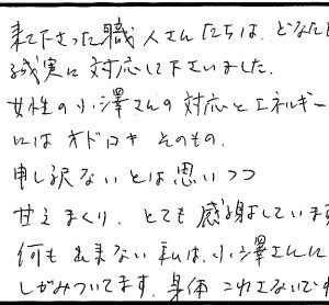 座間市立野台 K様 来て下さった職人さんたちは、だなたも誠実に対応して下さいました。女性の小澤さんの対応とエネルギーにはオドロキしのもの。 申し訳ないとは思いつつ、甘えまくり、とても感謝しています。 何も出来ない私は、小澤さんにしがみついています。 身体、こわさないでね。 お問合せ 座間市立野台 K様 お問い合せご相談・ご意見など見学会・勉強会についてその他お問い合せの内容を具体的にお聞かせください。お名前ふりがなメールアドレスご住所電話番号(携帯電話可)このフィールドは空のままにしてください。このフィールドは空のままにしてください。プライバシーポリシー プライバシーポリシーに同意します。 ※確認画面はございません。今一度、入力内容をご確認ください。 確認しました Δ お問合せ お問い合せ電話番号 営業時間:9:00~18:00 定休日:日曜日・祝祭日