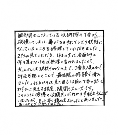 座間市緑ヶ丘 M様 観音開きになっている収納棚の丁番が破損してしまい、扉がひきずれてしまう状態になっているところを修理していただきました。 2社に見ていただき、1社の方は全面的に作り直さなければ無理と言われてましたが、丸山さんは現状チェック […] 詳細を見る 2022/6/27